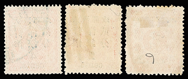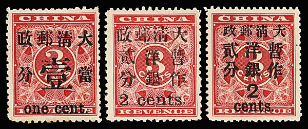 1897, 1¢ plus Small and Large 2¢ on 3¢ Red Revenues (Chan 84, 87-88. Scott 78-80), each fresh and sound with