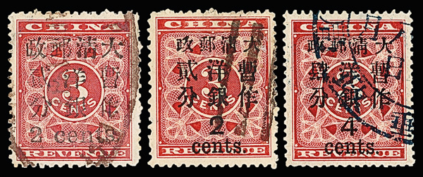 1897, Small and Large 2¢ and Large 4¢ on 3¢ Red Revenues (Chan 84, 88-89. Scott 79-80, 82), all fresh and