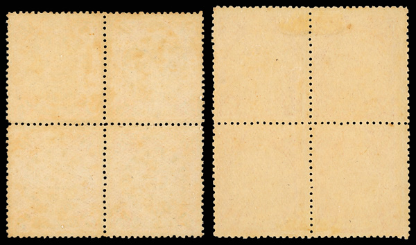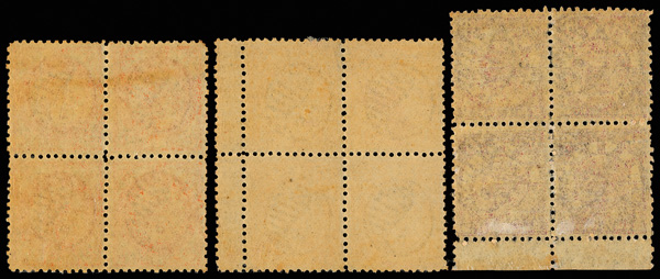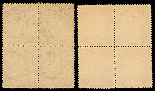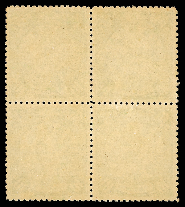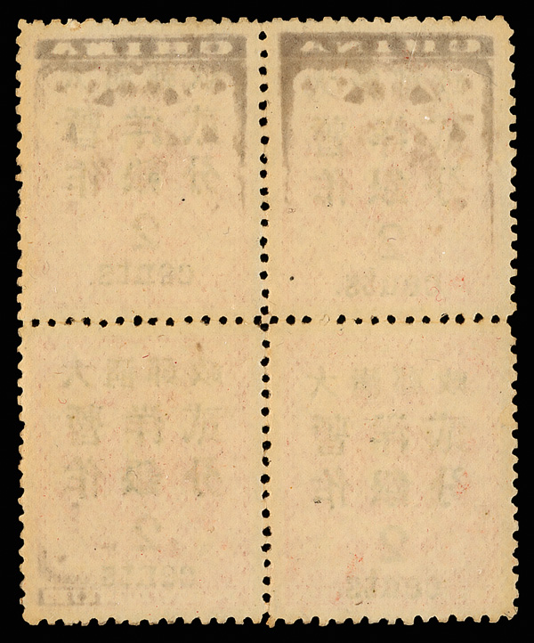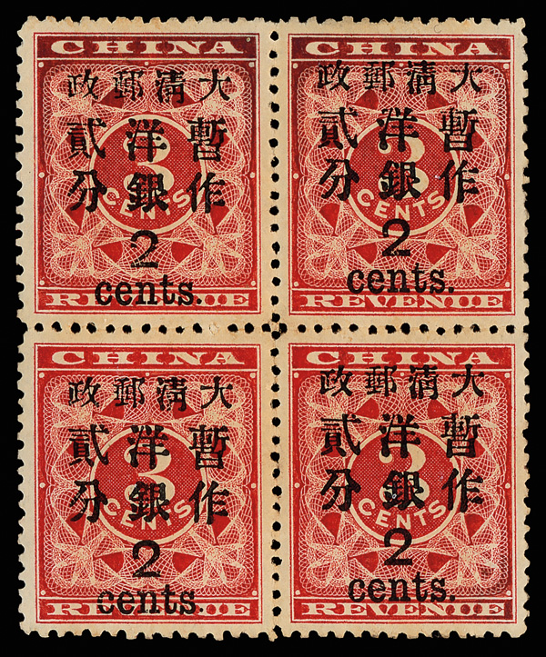 1897, Large 2¢ on 3¢ Red Revenue (Chan 88. Scott 80), block of 4, attractive with near-mathematically precise