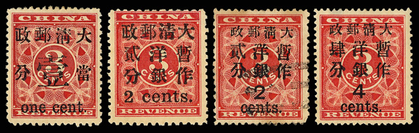 1897, 1¢ on 3¢ to 4¢ on 3¢ Red Revenues (Chan 84, 87-89. Scott 78-80, 82), attractive group of four