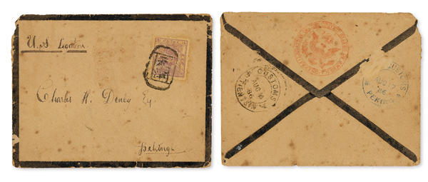 postmark; reverse shows red double-ring Legation imprint with Great Seal, and Customs cancels of Tientsin (Aug. 16, in black) and Peking (Aug. 17, in blue); heavy edge wear, still a rare first-year use—and a most uncommon cover, Fine. Only