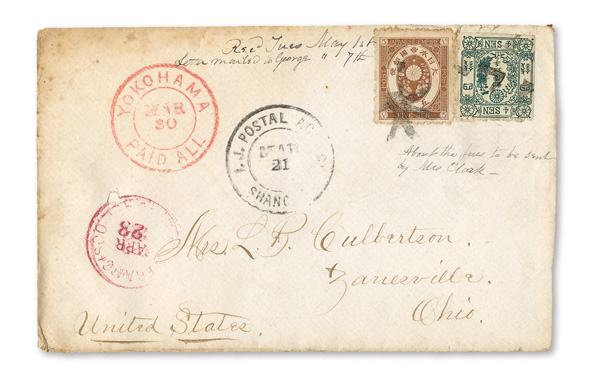 segmented cork cancels, the front additionally showing black "I.J. Postal Agency/Mar/21/Shanghai" origin and red "Yokohama/Paid All" (Mar. 30) and magenta "San Franciso/Paid All" (Apr. 23) transits; light toning and edge wear, Fine to Very Fine. (Image1) (Image2)