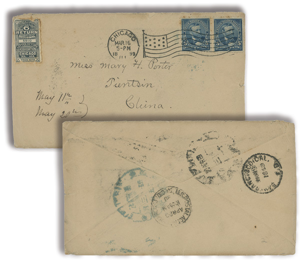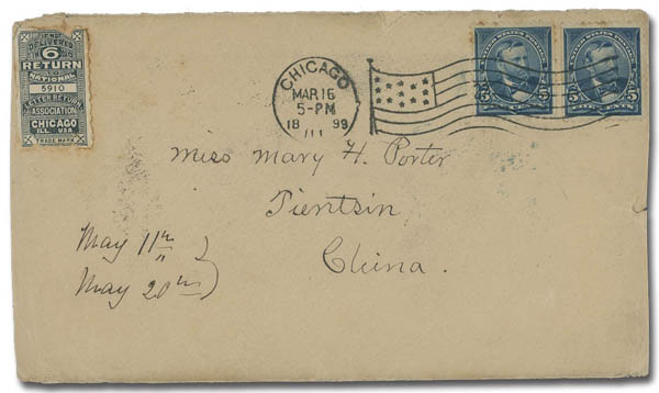 4125 cover image1899 (Mar. 16), Cover from Chicago, IL, to Tientsin, franked with US 5¢ pair (small faults) tied by Chicago flag cancel; San Francisco (Mar. 19) and Shanghai (Apr. 20) transits; on reverse "U.S. Postal Agency/Shanghai Rec'd" c.d.s. (Apr. 20) and "Tientsin" Large Dollar Dater (Apr. 24) in blue, Fine to Very Fine. (Image1) (Image2) (Image3) (All Images)