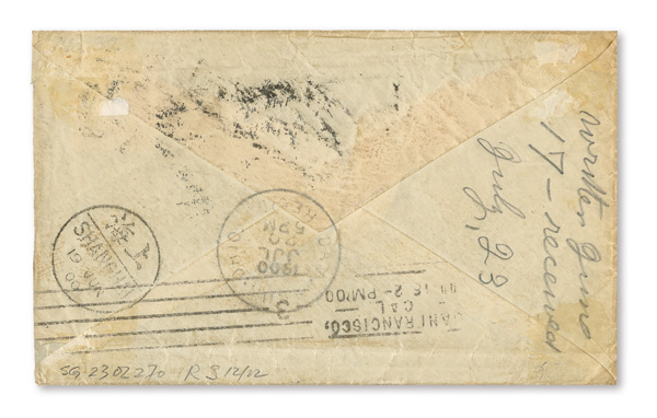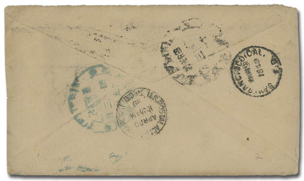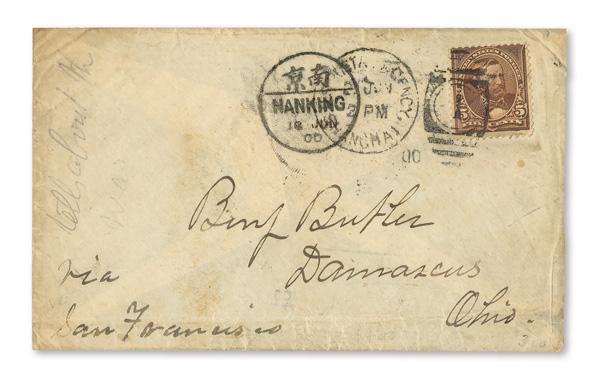4126 cover image1900 (June 18), Cash cover from Nanking to Damascus, Ohio, with bold Nanking bilingual postmark, the cover franked by US 5¢ Grant tied by US Postal Agency Shanghai duplex dated June 21; reverse with bilingual Shanghai (June 19) and San Francisco (July 18) transits plus Damascus receiver of July 20, Fine to Very Fine, a rare cash/US adhesive combination cover. (Image1) (Image2) (All Images)