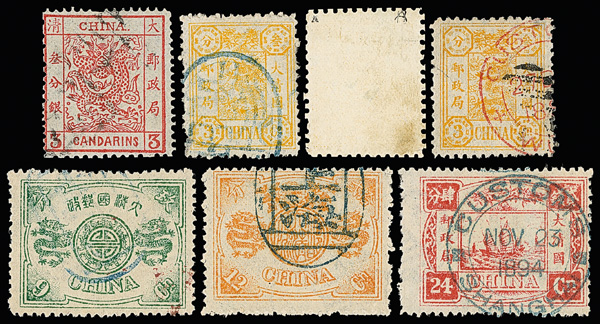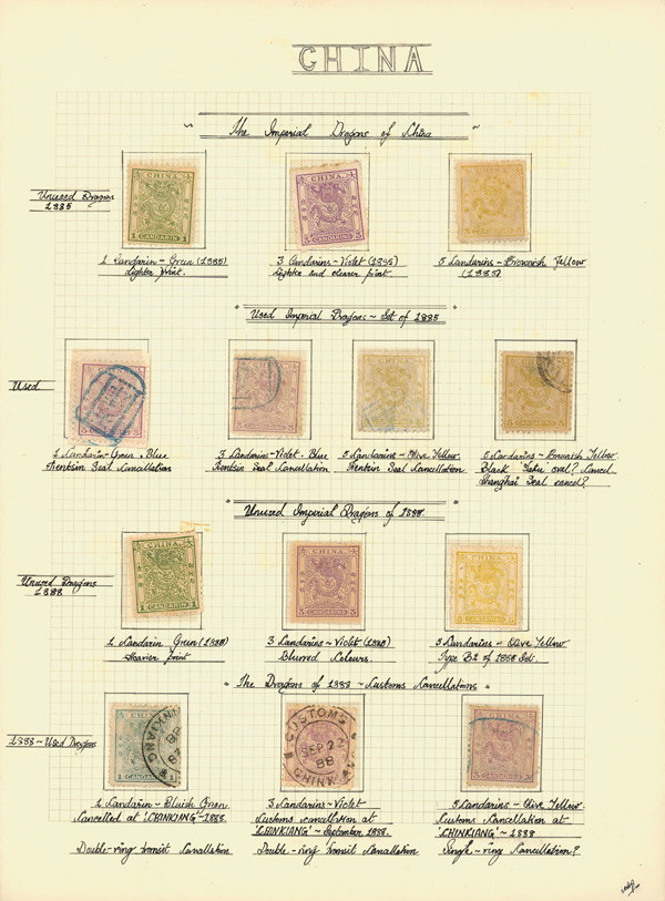 4131 imageChina, Mint and Used Classics Collection, 1878-97, on nine homemade quadrille pages with rich annotation, with a number of Large Dragons, and solid holdings of Small Dragons and surcharged Dowagers; we note some varieties, a range of cancel types (some centrally struck), numerous pairs, shades, etc.; some condition issues, but still useful and valuable for student and dealer alike, generally Fine to Very Fine, fully imaged online. (PDF for this Lot) (Image1) (All Images)