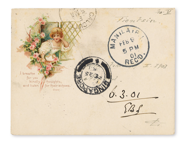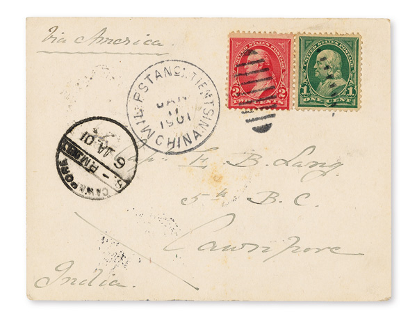 4127 cover image1901 (Jan. 17), Boxer Rebellion Postcard from Tientsin to Cawnpore, India, franked by US 1¢ green and 2¢ carmine First Bureau issues, tied by "MIL.PSTANo1 Tientsin China" duplex; endorsed "Via America", with Cawnpore Mar. 6 receiver on front; reverse with multi-color printed corner card, Manila (Feb. 9), Singapore (Feb. 25) and Calcutta (May 5) transits, nearly Very Fine, an attractive military use. (Image1) (Image2) (All Images)