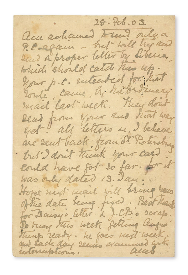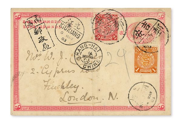 4130 O image1903 (Mar. 9), Postal card from Jian, Jiangsi to London, 1c ICP postal card, uprated by 1c and 2c CIP Coiling Dragons, tied by two strikes of dateless Jian postmarks; bilingual Kiukiang (Mar. 9), Chinese and French Shanghai (Mar. 14) transits, plus tombstone handstamp on front; correspondence on reverse datelined Feb. 28, Fine to Very Fine. (Image1) (Image2) (All Images)
