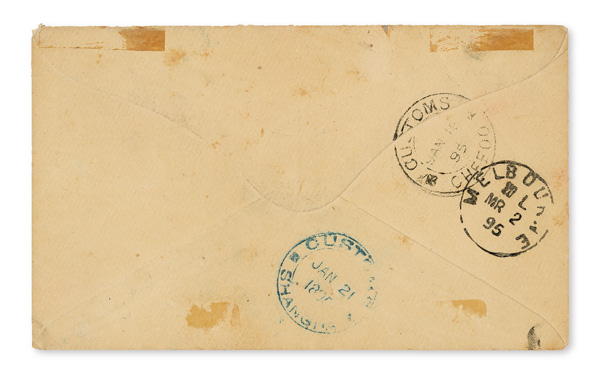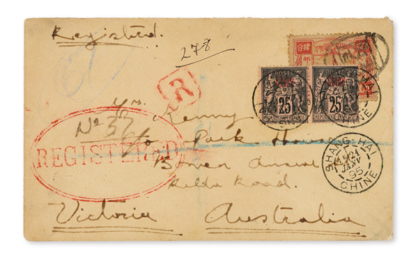 4122 cover image1895 (Jan. 18), Registered cover from Chefoo to Victoria, Australia, franked by 24ca Dowager tied by Chefoo seal cancel with horizontal pair of 25c French Offices in China overlaid, the latter tied by two of three French "Shang-haï/21/Janv/95/Chine" postmarks; front crossed in blue crayon with red octagonal "R" and double-oval "REGISTERED" handstamps; reverse with "Customs/Jan 18/95/Chefoo" origin postmark, plus blue Shanghai Customs (Jan. 21) and black Melbourne (Mar. 2) transits; a pretty combination cover, generally Fine to Very Fine. (Image1) (Image2) (All Images)