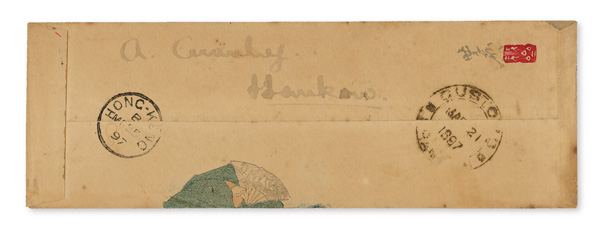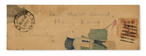 4124 cover image1897 (Mar. 18), Narrow illustrated cover from Hankow to Hong Kong, franked by 4c on 4ca Dowager, tied by Hankow pakua with "Customs/Mar 18/1897/Hankow" dater at left; reverse with brown Shanghai Customs transit (Mar. 21) and small-diameter "Hong-Kong/B/MR 25/97" receiver on reverse; addressed to the "Post Master General, Hong Kong", Fine to Very Fine. (Image1) (Image2) (All Images)