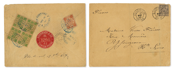 4123 cover image1896 (Nov. 18), Combination cover from Peking to Yssingeaux, France, franked on reverse by single 1ca and block of four 2ca Dowagers, tied by blue Peking seal cancels with matching "I.G. of Customs/Nov 18/96/Peking" origin, black "Customs/Shanghai" (Nov. 24) transit, and "Yssingeaux/Haute Loire" (Jan. 4, 1897) receiver—along with striking "Hackmack & Co./Tientsin-Peking" white on red wafer sealing backflap; front bears un overprinted France 25c single tied by one of two "Shang-haï/27/Nov./96/Chine" postmarks; a couple vertical file folds, one affecting the left two stamps of the block of four, Fine to Very Fine. (Image1)