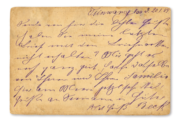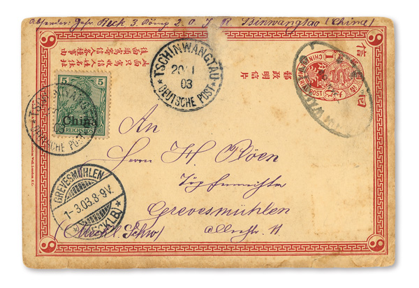 4129 O image1903 (Jan.), Postal card from Chinwangtao to Grevesmühlen, Germany, red second issue 1c CIP postal card uprated by "China"-overprinted 5pf Germania, the indicium cancelled by rare "Chinwangtao" oval postmark (date unclear, possibly 17 Jan 03), the German Offices stamp tied by one of two "Tschinwangtau/20/1 /03 Deutsche Post" postmarks; bridge-style receiver (Mar. 1) at lower left; soiling and scuffing, but still a rarely seen cancel, Fine to Very Fine. (Image1) (Image2) (All Images)