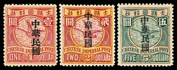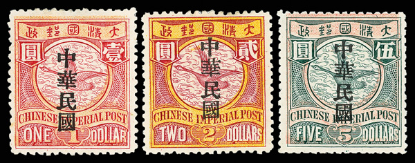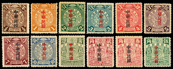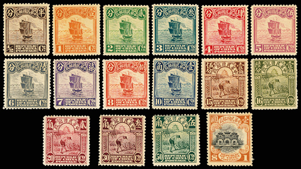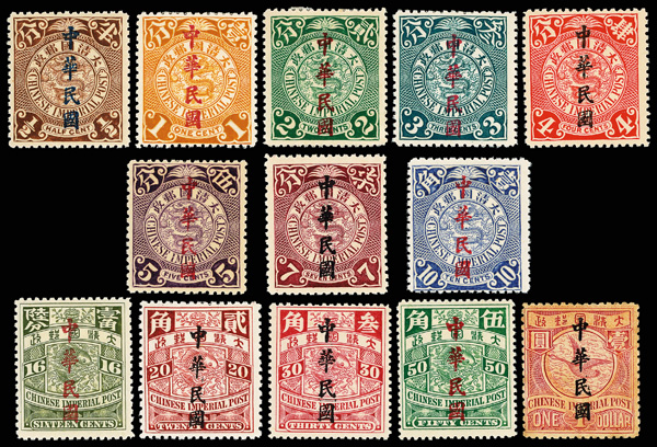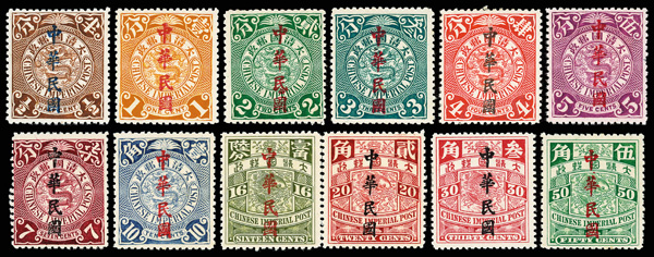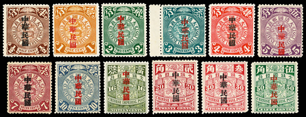 4138 og/ng image1912, Statistical Dept. "Republic" overprints, ½¢ to $5 complete (Chan 152-166. Scott 146-160), attractive set with vivid colors, 1¢ without gum, balance large to small part o.g. with many lightly hinged, 7¢ horizontal crease, otherwise fresh, Fine to Very Fine. Scott $1,832 (HK$ 14,090). (Image1) (Image2) (Image3) (Image4) (All Images)
