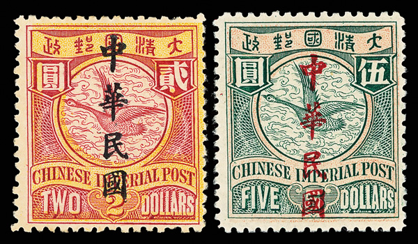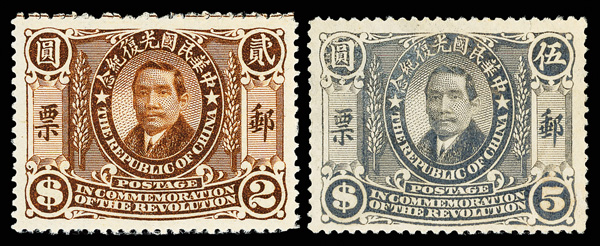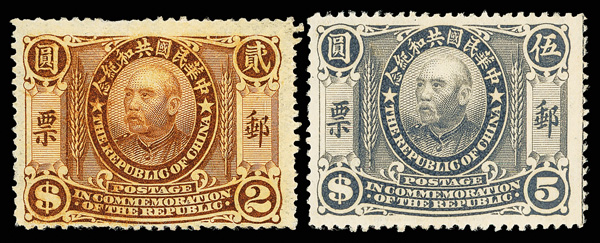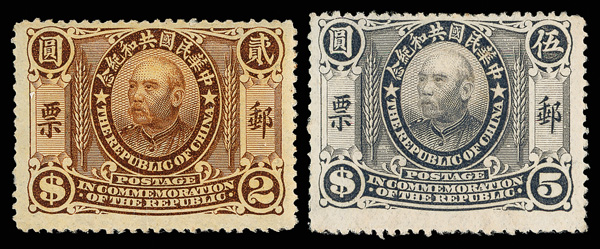 4151 og image1912, Republic Commemorative, $2 yellow brown & $5 slate (Chan 206-207. Scott 200-201), fresh with crisp impression and strong colors, paper bright and gum clean, o.g., hinged, Fine+. Scott $965 (HK$ 7,420). (Image1) (Image2) (All Images)