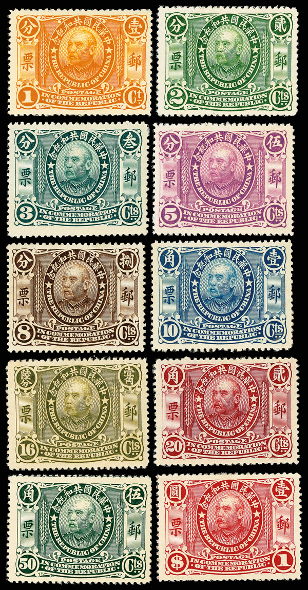 4146 og image1912, Waterlow & Sons "Republic" overprints, ½¢-$2 (Chan 169-182. Scott 163-176), an outstanding set complete to the $2 value, each having been selected for freshness of color and overall quality; large to small part o.g. with some hinge remnants or bits of paper adherence but no toning, an overall Very Fine and attractive set. Scott $1,245 (HK$ 9,580). (Image1) (Image2) (Image3) (Image4) (All Images)