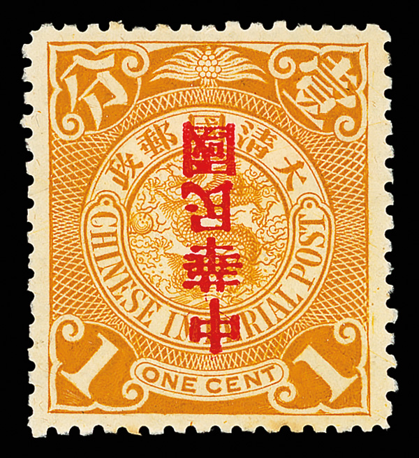 4144 og image1912, Commercial Press "Republic" overprint, 1¢ ocher, overprint inverted (Chan 167c. Scott 161a), Post Office fresh with exquisite color and centering, o.g., hinge remnant, Very Fine, a beauty. Scott $350 (HK$ 2,690). (Image1) (Image2) (All Images)