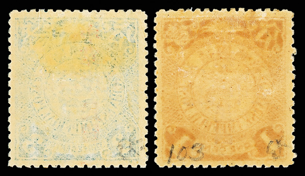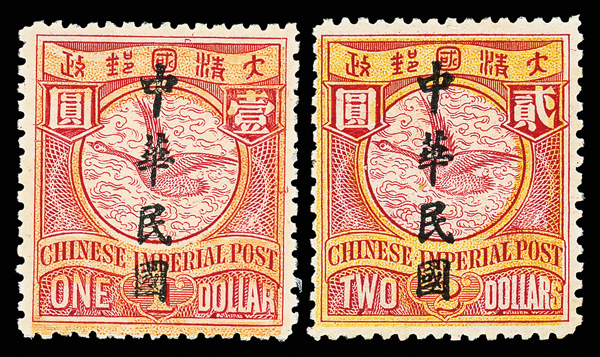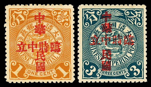 4136 og image1912, Nanking "Provisional Neutrality" overprint, 1¢ ocher & 3¢ blue green (Chan 144-145. Scott 138-139), face-fresh with proof-like detail in bold, clean color, o.g., lightly hinged; 1c with light, even gum browning, otherwise Very Fine. Scott $600 (HK$ 4,620). (Image1) (Image2) (All Images)