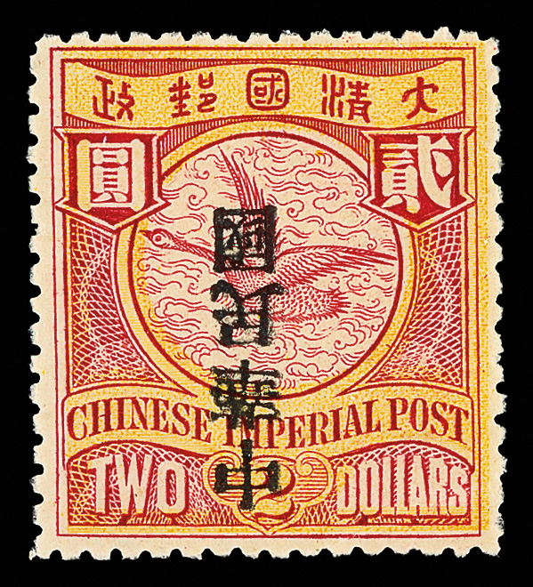 4143 og image1912, Statistical Dept. "Republic" overprint, $2 carmine & yellow, overprint inverted (Chan 165b. Scott 159a), a clean, bright gem of a stamp, sound, well-centered and in rich color, o.g., very lightly hinged, Very Fine+. Scott $725 (HK$ 5,580). (Image1) (Image2) (All Images)