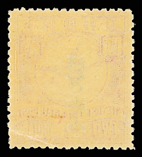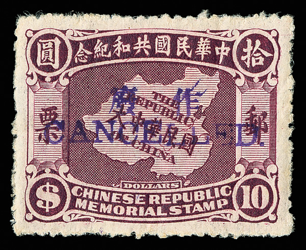4148 og image1912, Unissued $10 "Map of China", the high value of the set of 13, with proof-like detail and outstanding centering, the two-line "Tso Fei/Cancelled" handstamp crisp and clean, o.g., hinge remnant, Very Fine, a rare item, signed Livingston. (Image1) (Image2) (All Images)