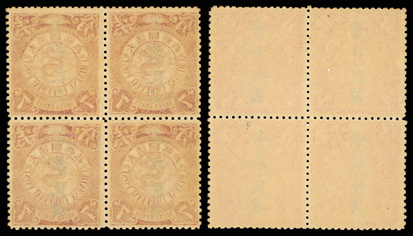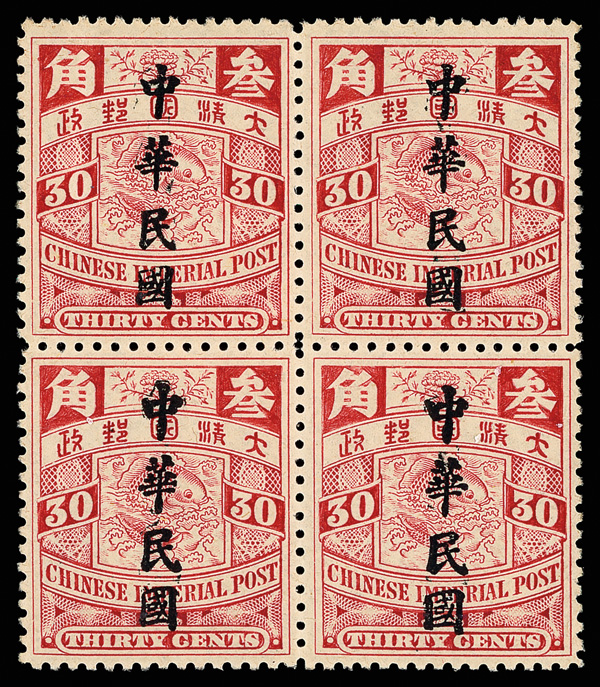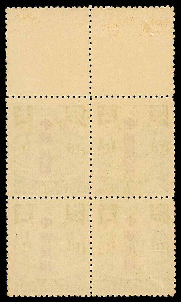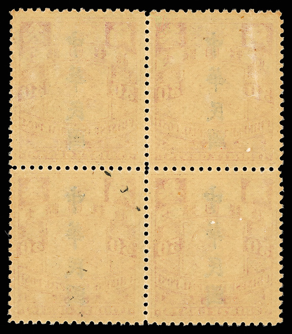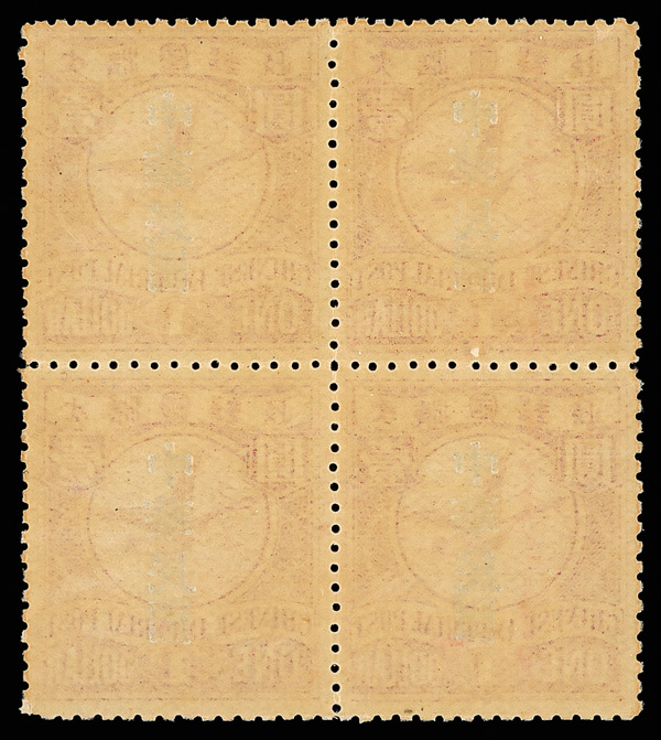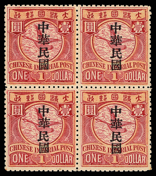 4142 nhbl image1912, Statistical Dept. "Republic" overprint, $1 red & pale rose (Chan 164. Scott 158), an extraordinary gem-quality block of four combining "fresh as the day it was printed" colors and truly pristine gum, o.g., never hinged, an Extremely Fine showpiece. Scott $1,800 as hinged singles (HK$ 13,850). (Image1) (Image2) (All Images)