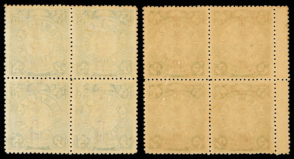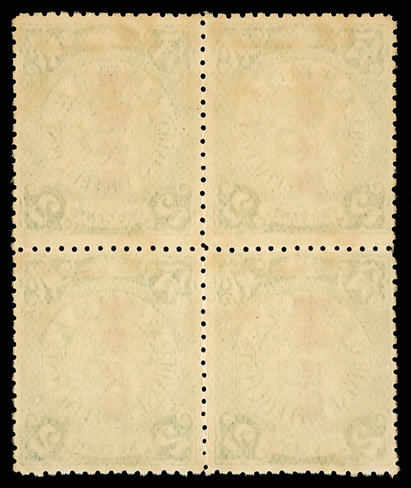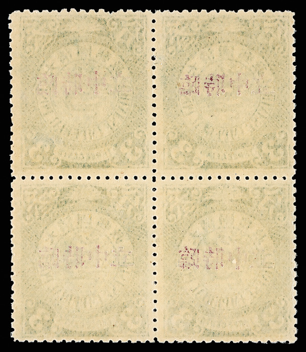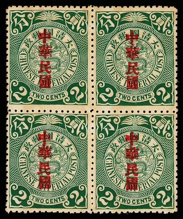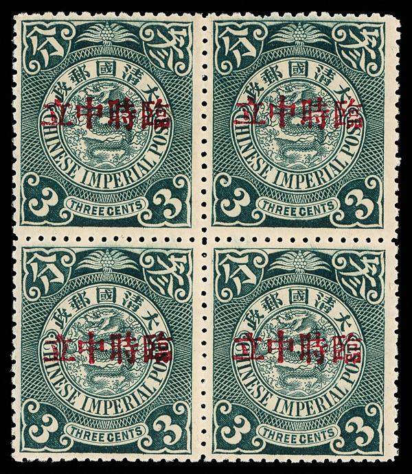 4134 nhbl image1912, Foochow "Provisional Neutrality" overprint, 3¢ blue green (Chan 140. Scott 134), block of 4, eye-catching and pristine with rich color, o.g., never hinged, Very Fine. Scott $1,200 as hinged singles (HK$ 9,230). (Image1) (Image2) (All Images)