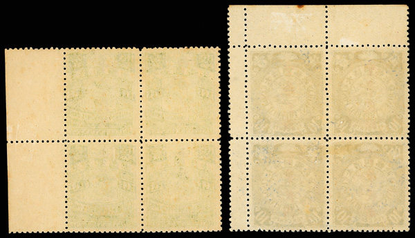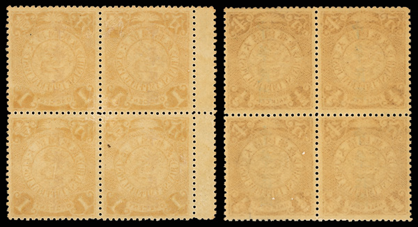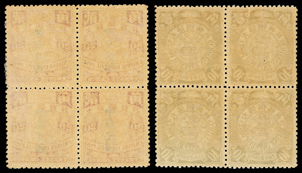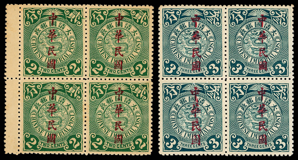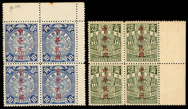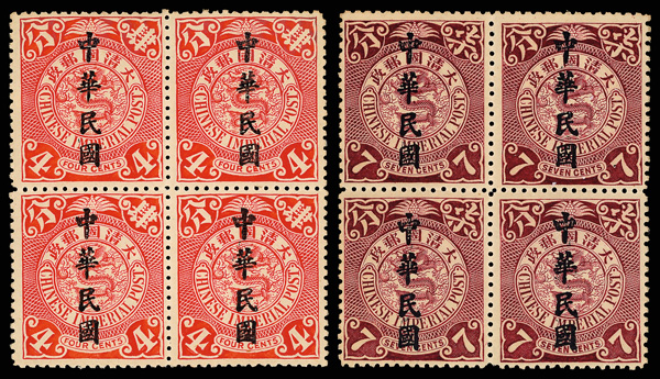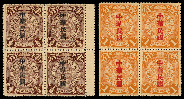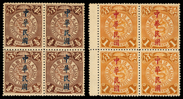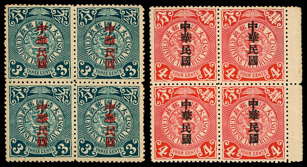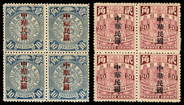 4139 nh/ogbl image1912, Statistical Dept. "Republic" overprints, ½¢ to 20¢ complete (Chan 152-161. Scott 146-155), blocks of 4, a gorgeous set, each with fresh color; never hinged except one each of the 4¢ and 20c values, Very Fine. Scott $1,216 as hinged singles (HK$ 9,350). (Image1) (Image2) (Image3) (Image4) (Image5) (Image6) (Image7) (Image8) (Image9) (Image10) (Image11) (Image12) (All Images)