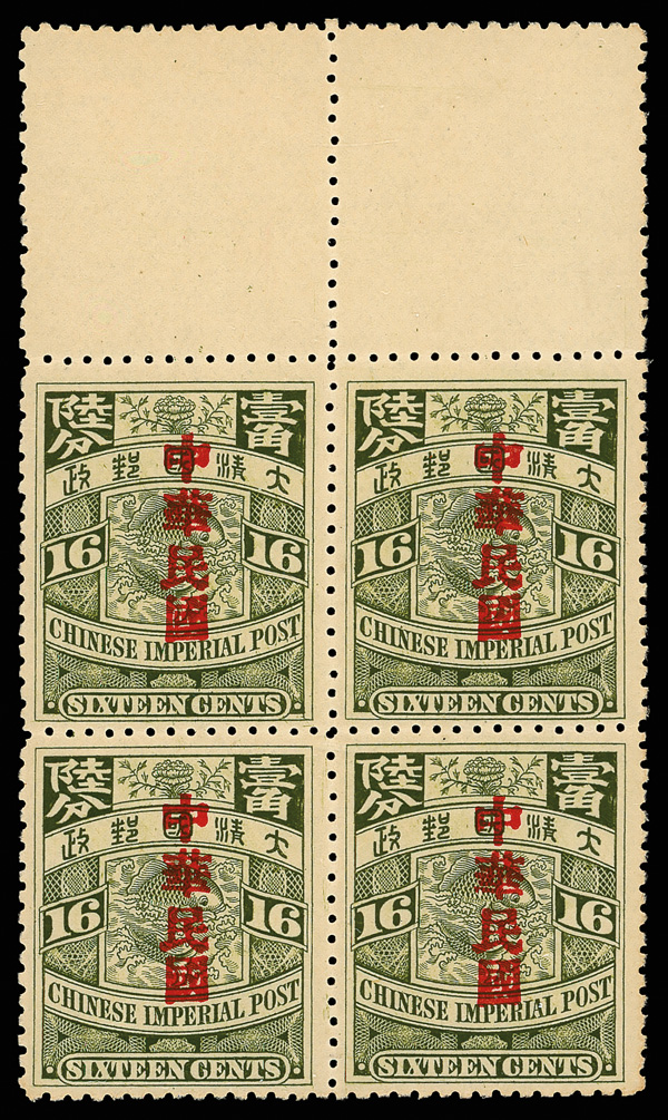 4140 nh/ogbl image1912, Statistical Dept. "Republic" overprint, 16¢ olive green (Chan 160. Scott 154), a stellar gutter block of 40 (8x5) with incredibly fresh color and excellent centering throughout; fresh o.g. with 36 stamps never hinged, choice Very Fine, a real beauty. Scott $900 as singles (HK$ 6,920). (Image1) (Image2) (All Images)