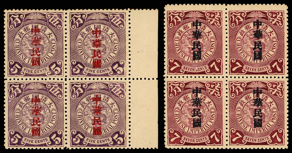 4147 nh/ogbl image1912, Waterlow & Sons "Republic" overprint, ½¢ brown//30¢ dull red (Chan 169-173, 175-177, 179. Scott 163-67, 169-71, 173), blocks of 4, all with fresh color; a single 3¢ very lightly hinged, all others never hinged, Very Fine, an attractive group. Scott $1,008 as hinged singles (HK$ 7,750). (Image1) (Image2) (Image3) (Image4) (Image5) (Image6) (Image7) (Image8) (Image9) (Image10) (All Images)