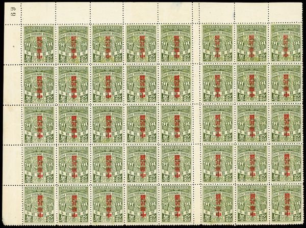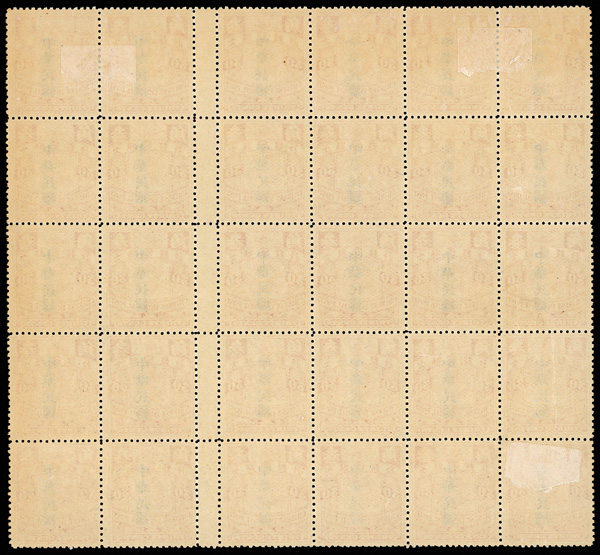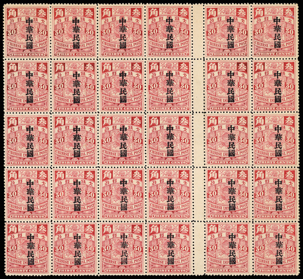 4141 nh/ogbl image1912, Statistical Dept. "Republic" overprint, 30¢ dull red (Chan 162. Scott 156), gutter block of 30, eye-catching with fresh color and excellent centering throughout; 25 stamps never hinged, Very Fine, a beautiful block. Scott $780 as hinged singles (HK$ 6,000). (Image1) (Image2) (All Images)
