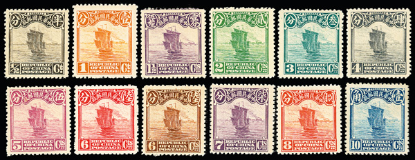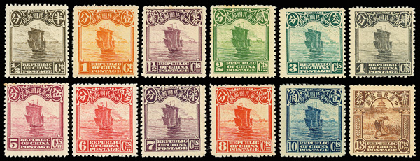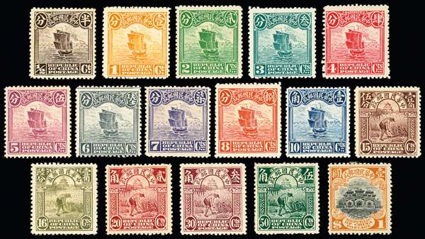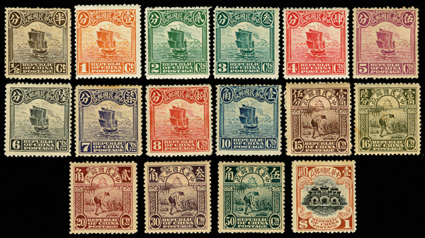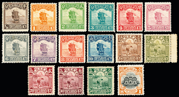 196 og image1915, Junk Issue, First Peking printing, ½¢-$10 complete (Chan 227//247. Scott 221-239), fresh and sound with bright colors and crisp detail; some dryish gum, hinged to varying degrees, generally Fine to Very Fine, ex "Sunrise Collection". Scott $2,643 (HK$ 20,330). (Image1) (Image2) (Image3) (Image4) (All Images)