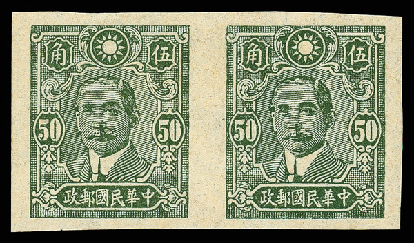 210 ng image1942, Dr. Sun Yat-sen, Central Trust printing, 50¢ deep olive green, thin paper, imperforate pair (Chan 582b. Scott 498 var.), a lovely item with clean impression, strong color, and full, balanced margins all around, without gum as issued, rare, unpriced, ex "Sunrise Collection". (Image1) (Image2) (All Images)