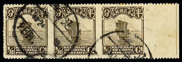 200 O image1923, Junk, Second Peking printing, ½¢ sepia, horizontal strip of three, imperforate between and at right margin (Chan 249di. Scott 248), clean and sound with bold color and crisp detail, bearing two strikes of Peiping bilingual cancel, Very Fine, rare, ex "Sunrise Collection". (Image1) (Image2) (All Images)