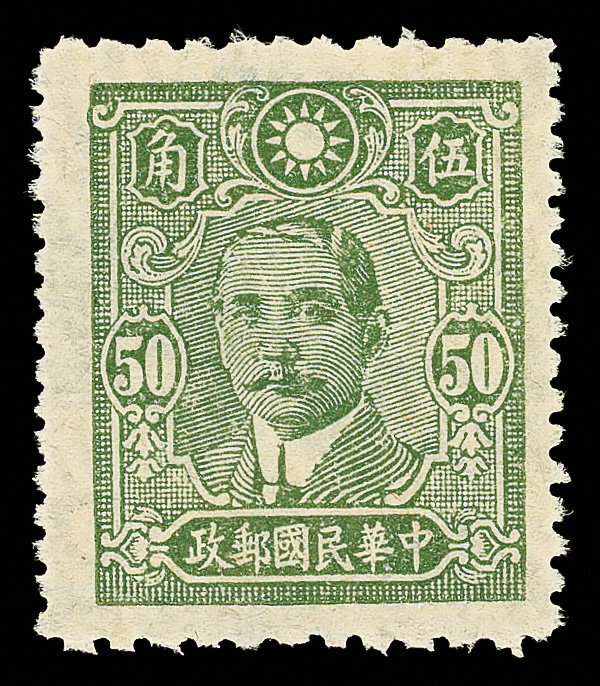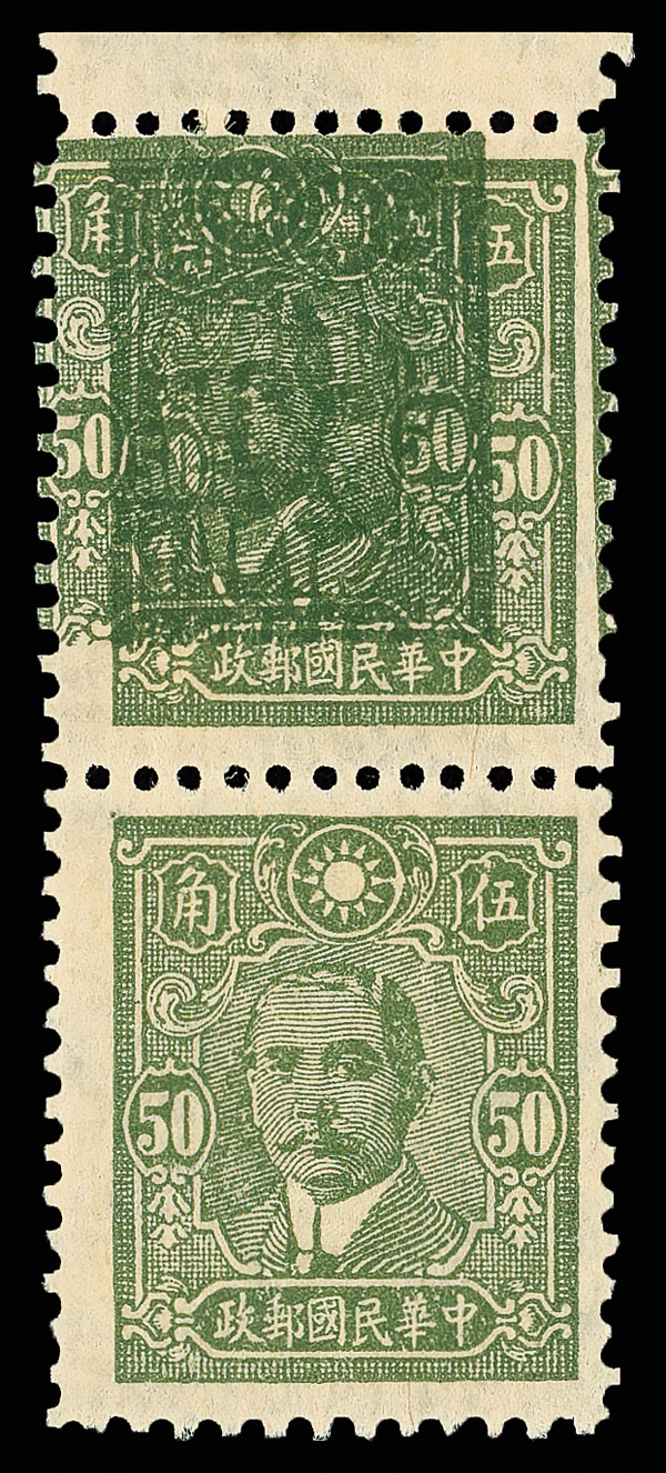 207 ng image1942, Dr. Sun Yat-sen, Central Trust printing, 50¢ deep olive green, perf 11½ double impression (Chan 562a var. Scott 498 var.), fresh and clean, the top stamp in a top margin vertical pair, the second impression right-way up (not sideways as listed in Chan), without gum as issued, Very Fine, very scarce, ex "Sunrise Collection". (Image1) (Image2) (All Images)