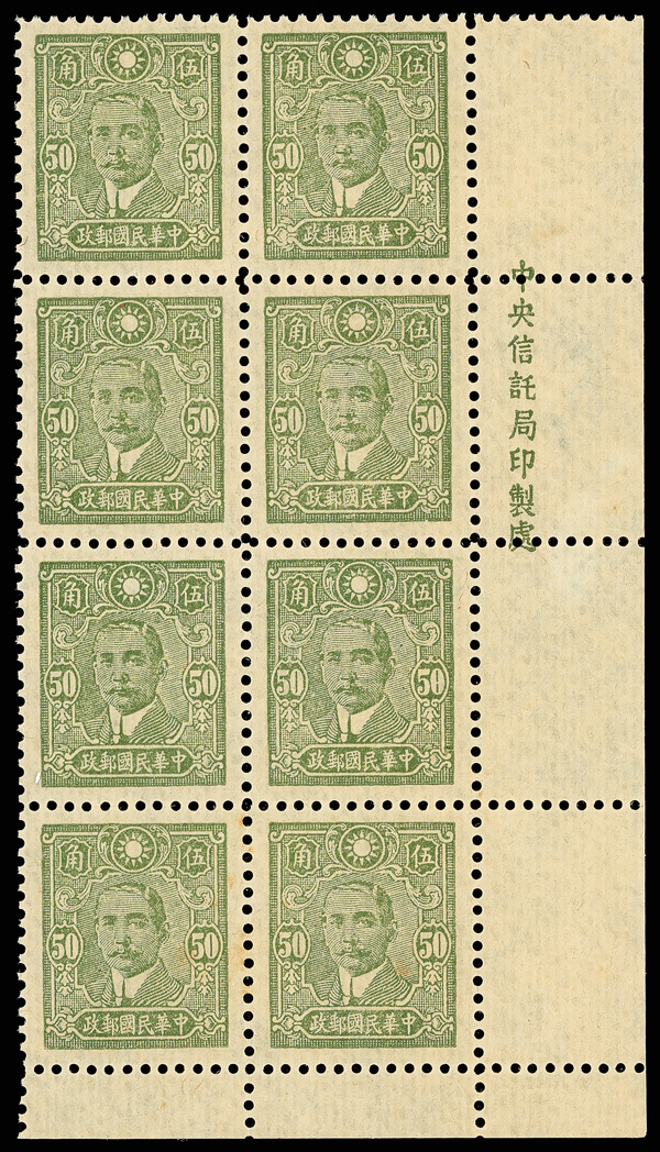 208 ng image1942, Dr. Sun Yat-sen, Central Trust printing, 50¢ deep olive green, perf 11 & perf 11x13 (Chan 567, 576a. Scott 498 var., 498a), two varieties, the perf 11 in pristine right margin imprint block of eight, plus a very scarce perf 11x13 variety, without gum as issued, Very Fine, ex "Sunrise Collection". (Image1) (Image2) (Image3) (Image4) (All Images)