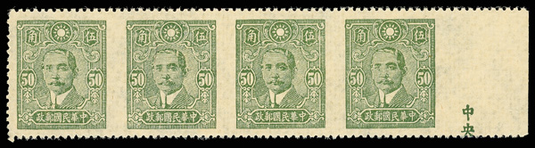 205 ng image1942, Dr. Sun Yat-sen, Central Trust printing, 50¢ deep olive green, imperforate between and at right margin (Chan 554d var. Scott 498 var.), right margin horizontal strip of 4, Post Office fresh, without gum as issued, Very Fine, choice and rare, ex "Sunrise Collection", signed L.Y. Woo. (Image1) (Image2) (All Images)
