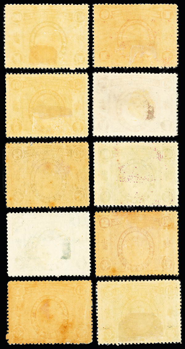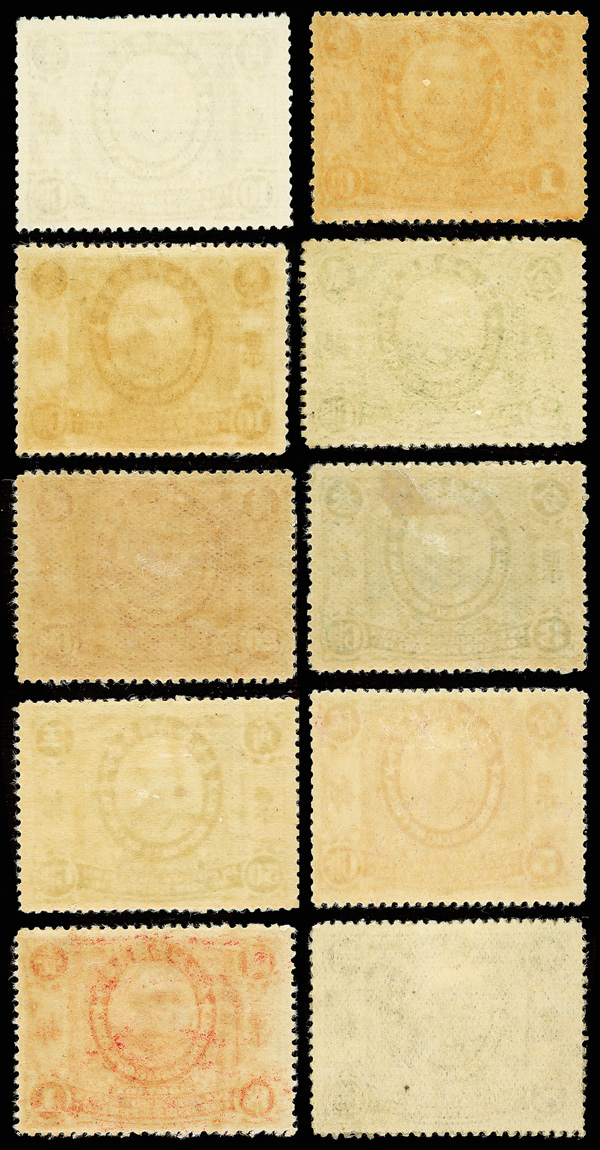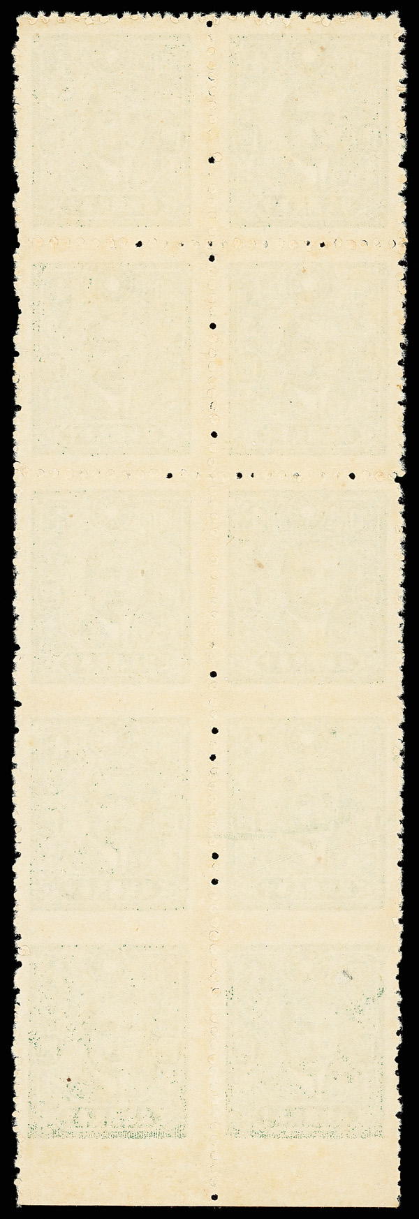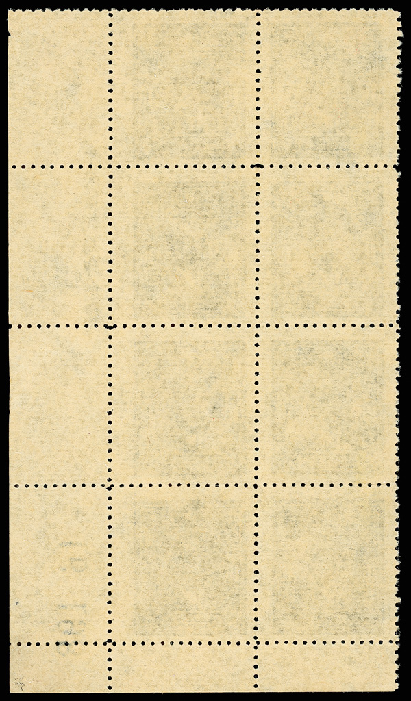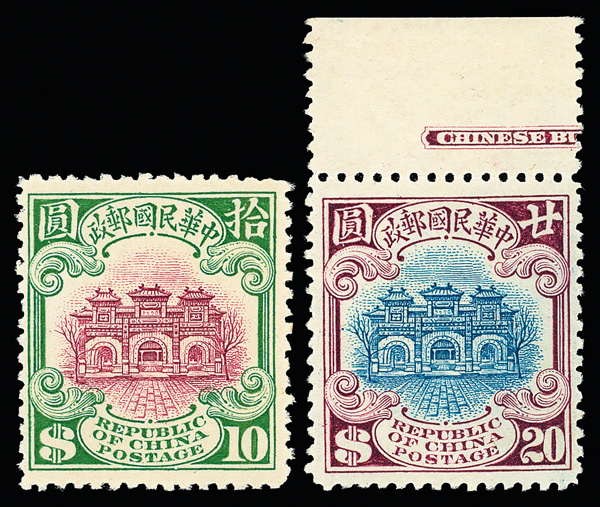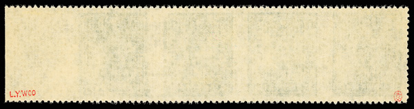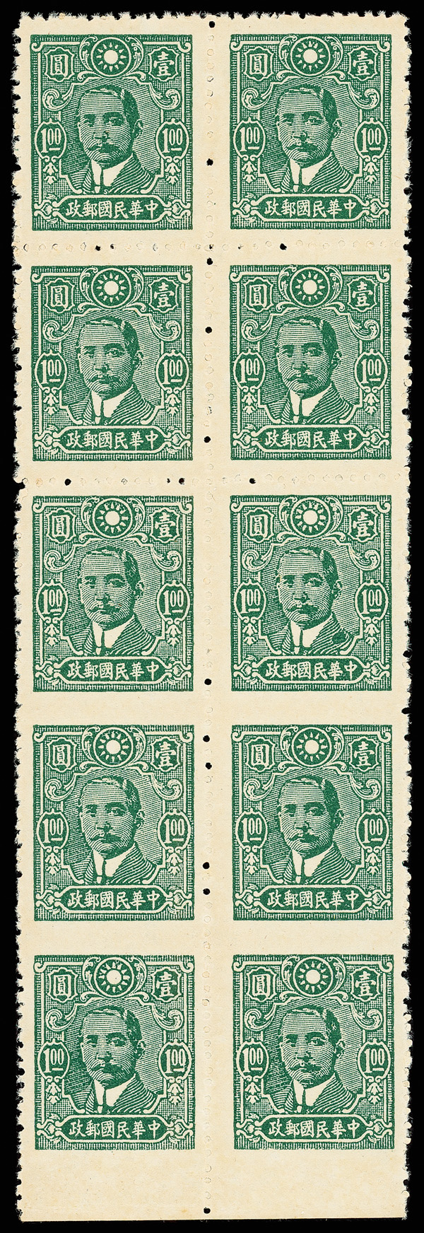 211 ng image1943, Dr. Sun Yat-sen, Central Trust printing, $1 green, perf 13, imperforate between and at bottom margin (Chan 590 var. Scott 500 var.), a lovely bottom margin vertical block of ten, yielding two strips of three imperforate between and at bottom margin, Post Office fresh and striking, without gum as issued, Very Fine, very scarce—and unlisted, ex "Sunrise Collection". (Image1) (Image2) (All Images)