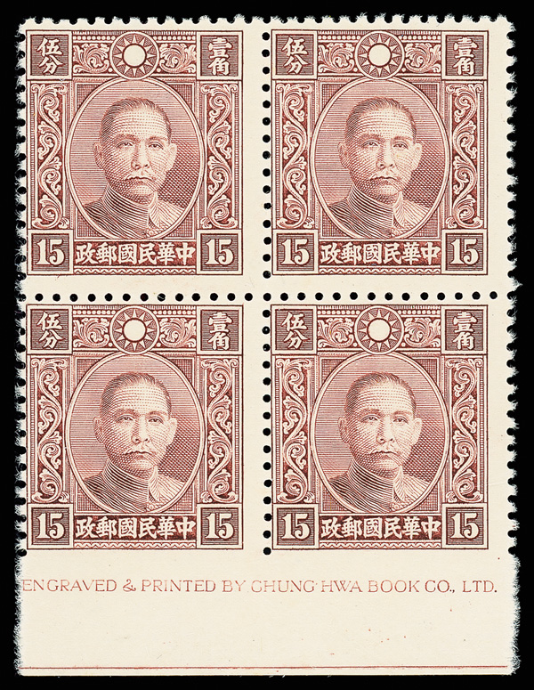 201 ng image1939, Dr. Sun Yat-sen, Chung Hwa printing, Die III, 15¢ deep violet brown, imperforate at bottom margin (Chan 378 var. Scott 356 var.), bottom margin block of four with Chung Hwa imprint, crisply printed in luxuriant color, without gum as issued, Fine to Very Fine, unlisted, ex "Sunrise Collection". (Image1) (Image2) (All Images)