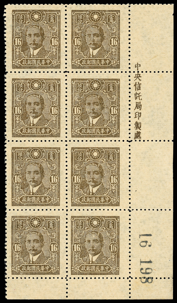 203 ngbl image1942, Dr. Sun Yat-sen, Central Trust printing, 16¢ olive brown, perf 13, thin "16" (Chan 549a. Scott 493 var.), bottom right corner margin vertical imprint block of 8 with sheet number, a lovely, sound positional, the bottom right stamp showing the scarce variety, without gum as issued, Very Fine, ex "Sunrise Collection". (Image1) (Image2) (All Images)