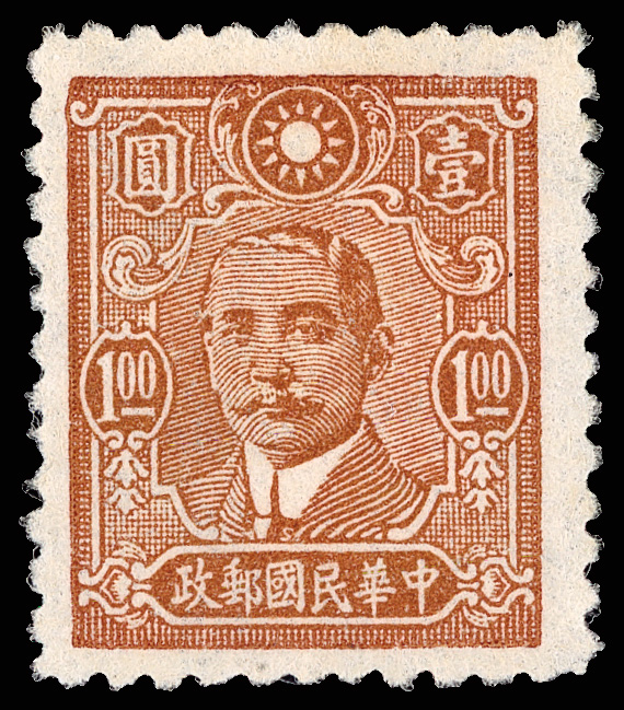 209 ng image1942, Dr. Sun Yat-sen, Central Trust printing, $1 brownish red, perf 11 (2000 Chan 568. Scott 499a), fresh with clean impression on bright white paper, without gum as issued, Very Fine, scarce, ex "Sunrise Collection". Scott $40 (HK$ 310). (Image1) (Image2) (All Images)