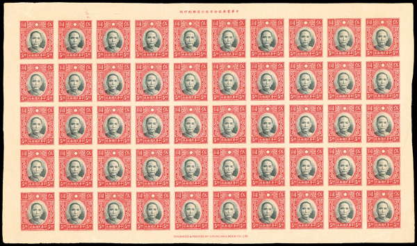 202 ngbl image1939, Dr. Sun Yat-sen, Chung Hwa printing, Die III, $5 gray green & scarlet, imperforate printers waste (Chan 383a var. Scott 361 var.), full sheet of 50, fresh with crisp detail in solid colors, imprints top and bottom, without gum as issued; unevenly cut at right, light corner/edge flaws to selvage as to be expected, still Very Fine, a pretty piece. (Image1) (Image2) (All Images)