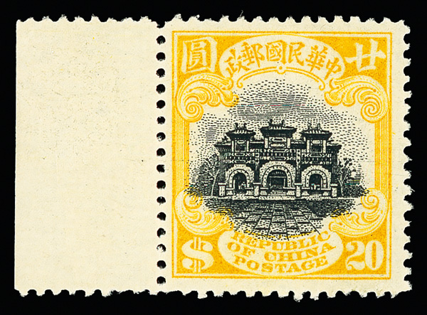 197 og image1915, Hall of Classics, First Peking printing, $20 yellow & black (Chan 248. Scott 242), left margin single, a simply breathtaking stamp, Post Office fresh in every respect—from the vibrant yellow and deeply engraved vignette to the pristine o.g., which shows only the absolute slightest evidence of hingeing, Extremely Fine and choice, hard to imagine a nicer example. Scott $6,500 (HK$ 50,000). (Image1) (Image2) (All Images)