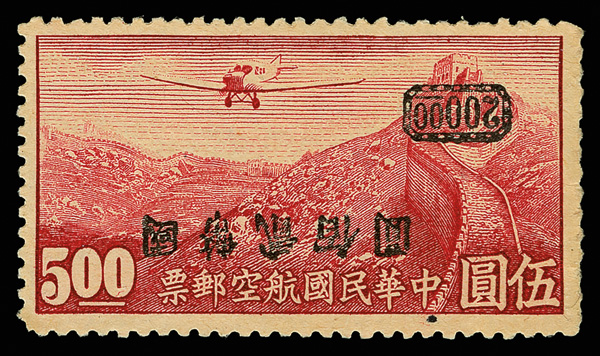 268 ng imageAirmail, 1946, C.N.C. surcharge on Hong Kong printing, unwatermarked, $200 on $5 deep red, surcharge inverted (Chan A52a. Scott C52a), fresh with intense color and attractive centering, without gum as issued, Very Fine, ex "Sunrise Collection". Scott $400 (HK$ 3,080). (Image1) (Image2) (All Images)
