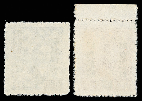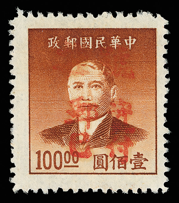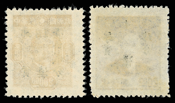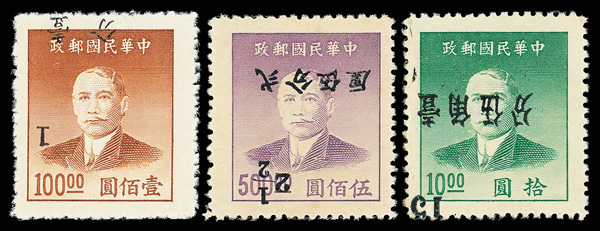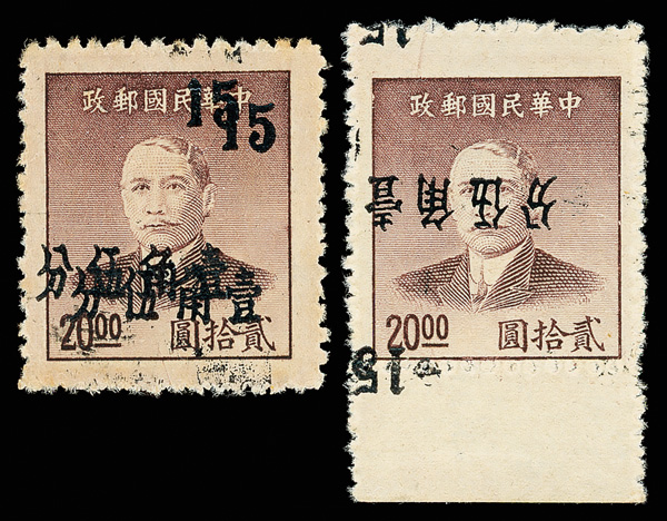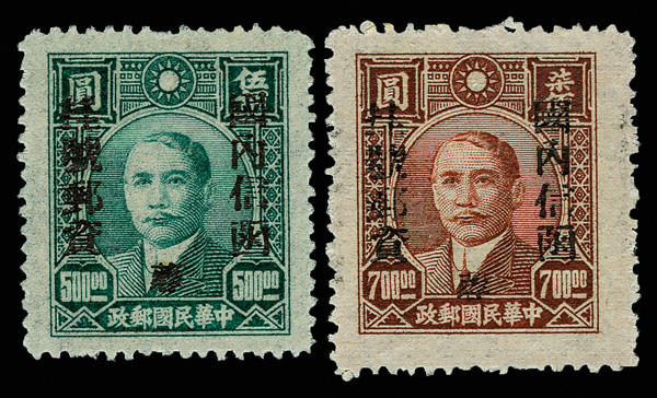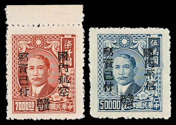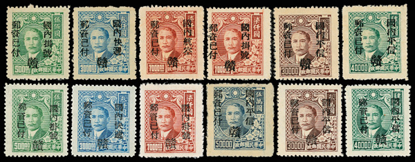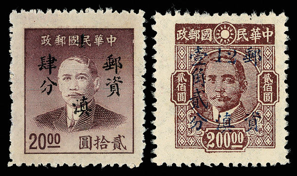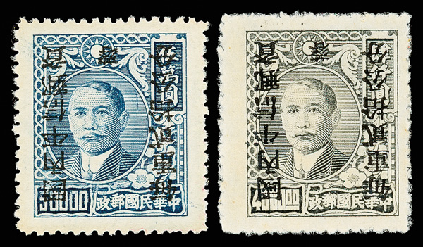 257 ng image1949, Unit Stamp, West Szechwan "Domestic Ordinary" overprint on Dr. Sun Yat sen and Plum Blossoms, $4,000 gray & $50,000 blue, overprint inverted (Chan S119c, S127c. Scott 30 var., 38 var.), each fresh and bright, sound with crisp color, without gum as issued, Very Fine, a scarce twosome, ex "Sunrise Collection". (Image1) (Image2) (All Images)