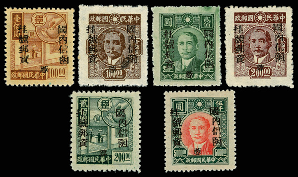 265 ng image1949, Unit Stamps, West Szechwan "Domestic Registered" overprints, $100-$5,000 complete (Chan SR1-SR8. Scott F1-F8), fresh and bright with rich colors, without gum as issued, Very Fine, ex "Sunrise Collection". Scott $1,010 (HK$ 7,770). (Image1) (Image2) (Image3) (Image4) (All Images)