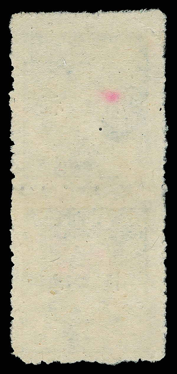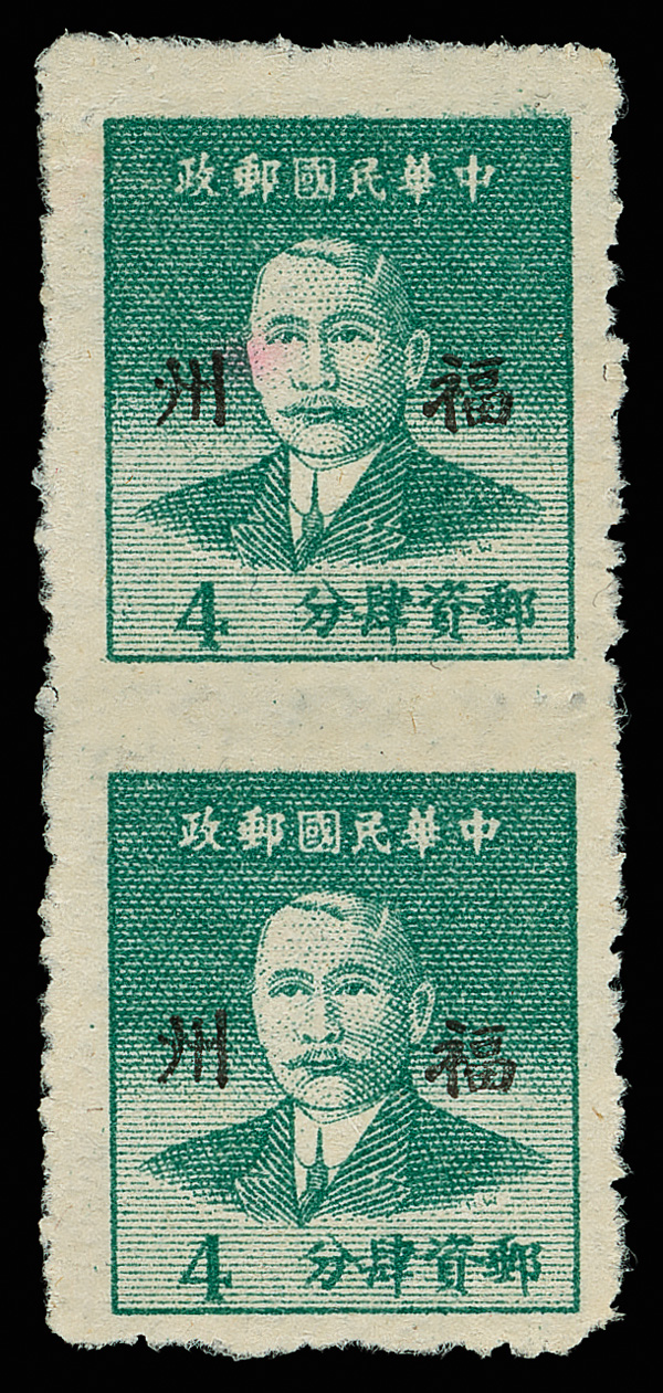 261 ng image1949, Silver Yuan, Foochow machine overprint on Dr. Sun Yat-sen, Hwa Nan printing, 4¢ gray green, vertical pair, imperforate between (Chan S188 var. Scott 975 var.), fresh with appealing centering, without gum as issued; faint, tiny red mark on upper stamp, otherwise Very Fine, unlisted and rare, ex "Sunrise Collection". (Image1) (Image2) (All Images)