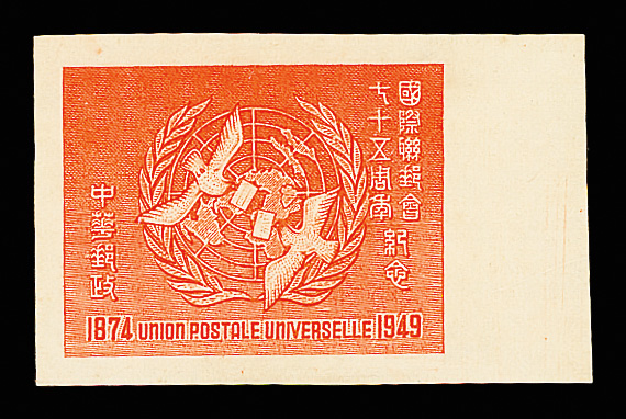 252 ng image1949, Silver Yuan, U.P.U., $1 orange red, value omitted (Chan S33a. Scott 988 var.), choice right margin single, Post Office fresh with massive, balanced margins, without gum as issued, Extremely Fine, rare, ex "Sunrise Collection". (Image1) (Image2) (All Images)