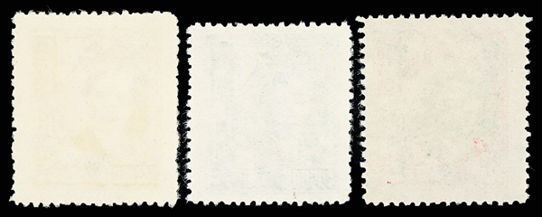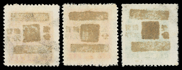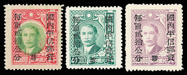 264 ng image1949, West Szechwan Unit Stamps, set of three unissued values (Chan SPN11-SPN13), comprising $20,000 yellow green & red, $400,000 green and $500,000 rose lilac, pristine and sound, without gum as issued, Very Fine, a rare and seldom-offered group, ex "Sunrise Collection". (Image1) (Image2) (All Images)
