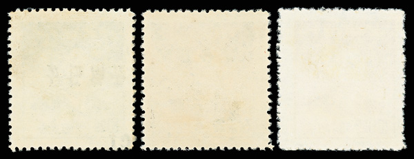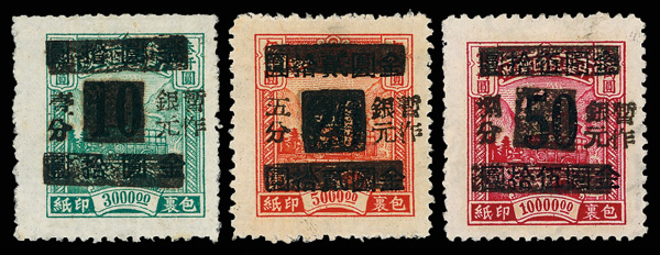 260 ng image1949, Watlam, manual overprints complete (Chan S158, S159, S162), comprising formal numerals 1c on $10 on $3000 green and 8c on $50 on $10000 (#S158, S162) and simple numeral 5c on $20 on $5000 (#S159), each Post Office fresh with strong color and bold strike of overprint, without gum as issued, Very Fine, rare. (Image1) (Image2) (All Images)
