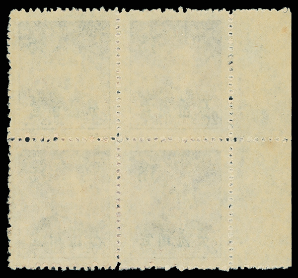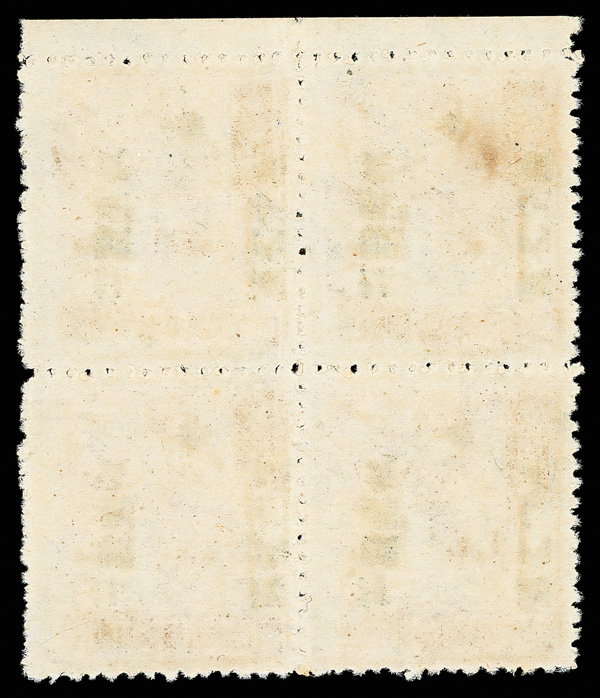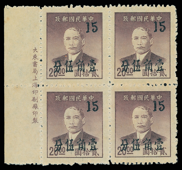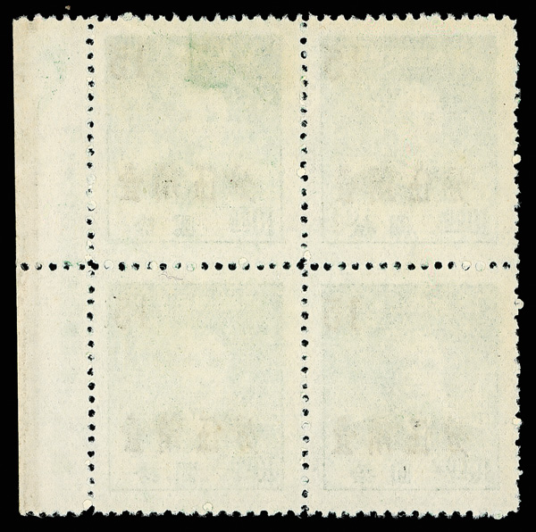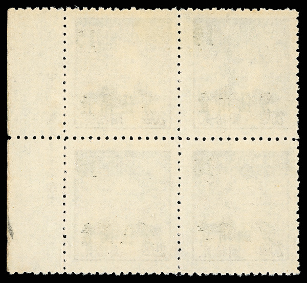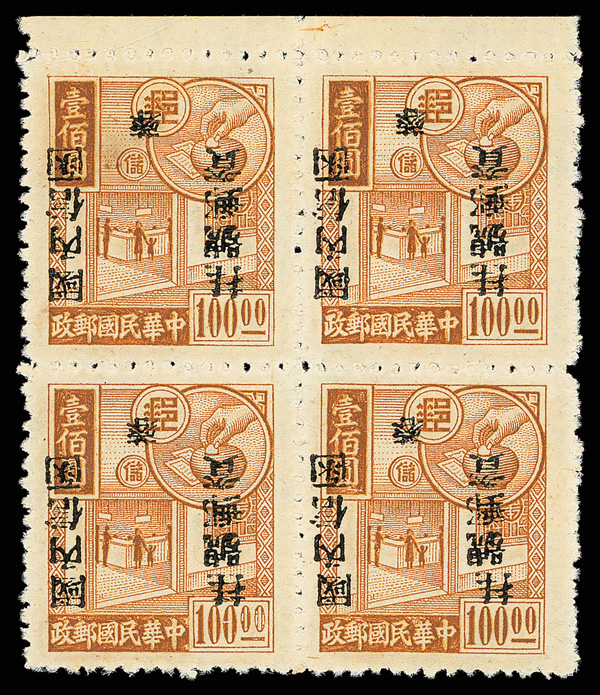 266 ngbl image1949, Unit Stamp, West Szechwan "Domestic Registered" overprint on Postal Savings, $100 yellow brown (Chan SR3 vars. Scott F1 var.), top margin block of four, all with overprint inverted (Chan #SR3c), the bottom two stamps additionally showing the "top character shifted to left" variety (note these are at top in our image), without gum as issued, Very Fine, scarce and unlisted, ex "Sunrise Collection". (Image1) (Image2) (All Images)