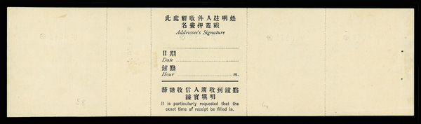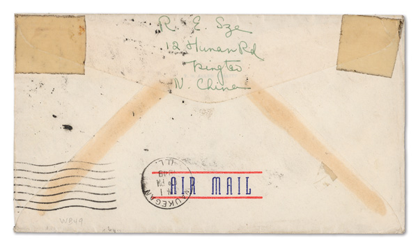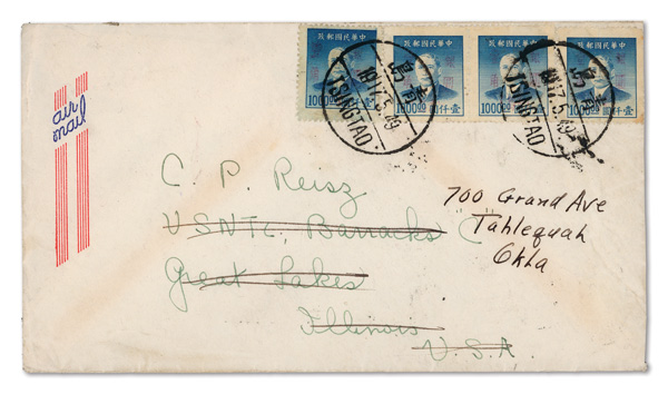 263 cover image1949, Silver Yuan, Tsingtao surcharge on Dr. Sun Yat-sen, 10¢ on $1,000 blue (Chan S202. Scott 4), horizontal strip of three plus single (showing shade variety), all tied by two strikes of bilingual Tsingtao postmark of May 17, 1949 on Airmail cover to the US (Great Lakes, Illinois, forwarded to Tahlequah, Okla.); some faint toning, but otherwise sound and an uncommon use, Fine to Very Fine. (Image1) (Image2) (All Images)