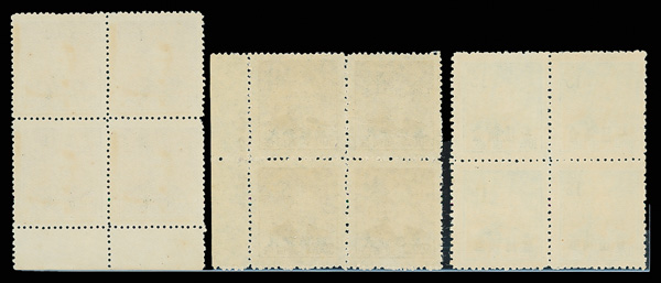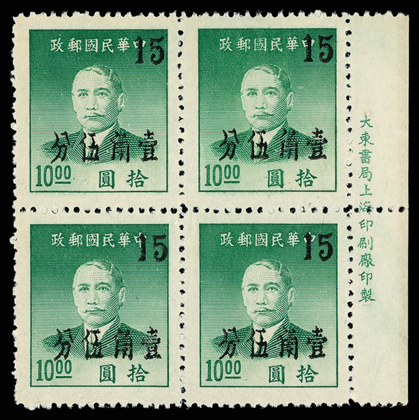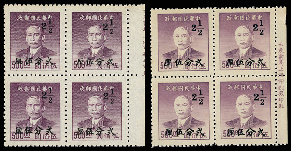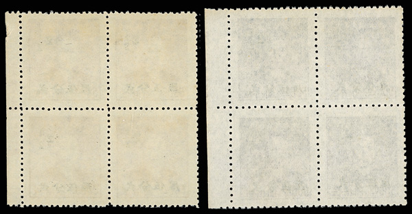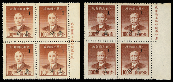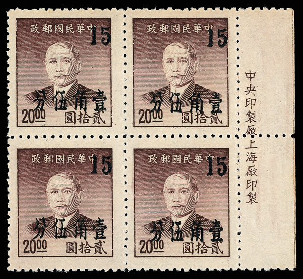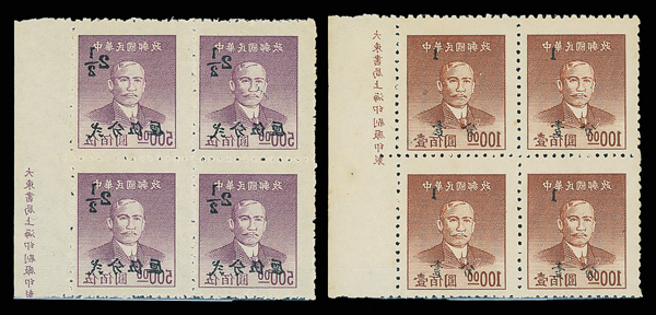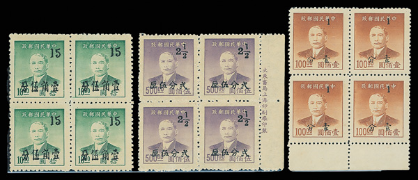 254 ngbl image1949, Silver Yuan, Kwangtung surcharges on Dr. Sun Yat-sen complete (Chan S95-S100. Scott 991-996), right margin imprint blocks of four except one of the 2½¢ values, all with fresh colors, without gum as issued, Very Fine. Scott $570 as singles (HK$ 4,380). (Image1) (Image2) (Image3) (Image4) (Image5) (Image6) (Image7) (Image8) (All Images)